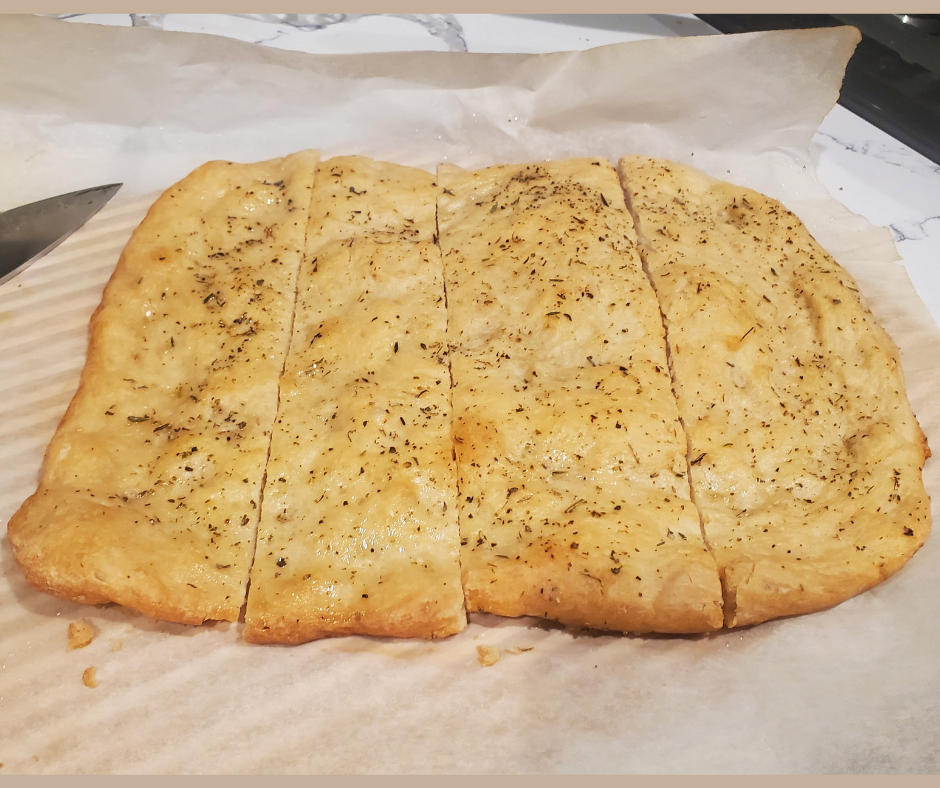 To make flatbread, take a grapefruit-sized ball of dough and place it on a cookie sheet lined with parchment paper. Stretch it out to fit the pan. As you press it out, don’t worry about the little finger divots—they’ll bake out beautifully.